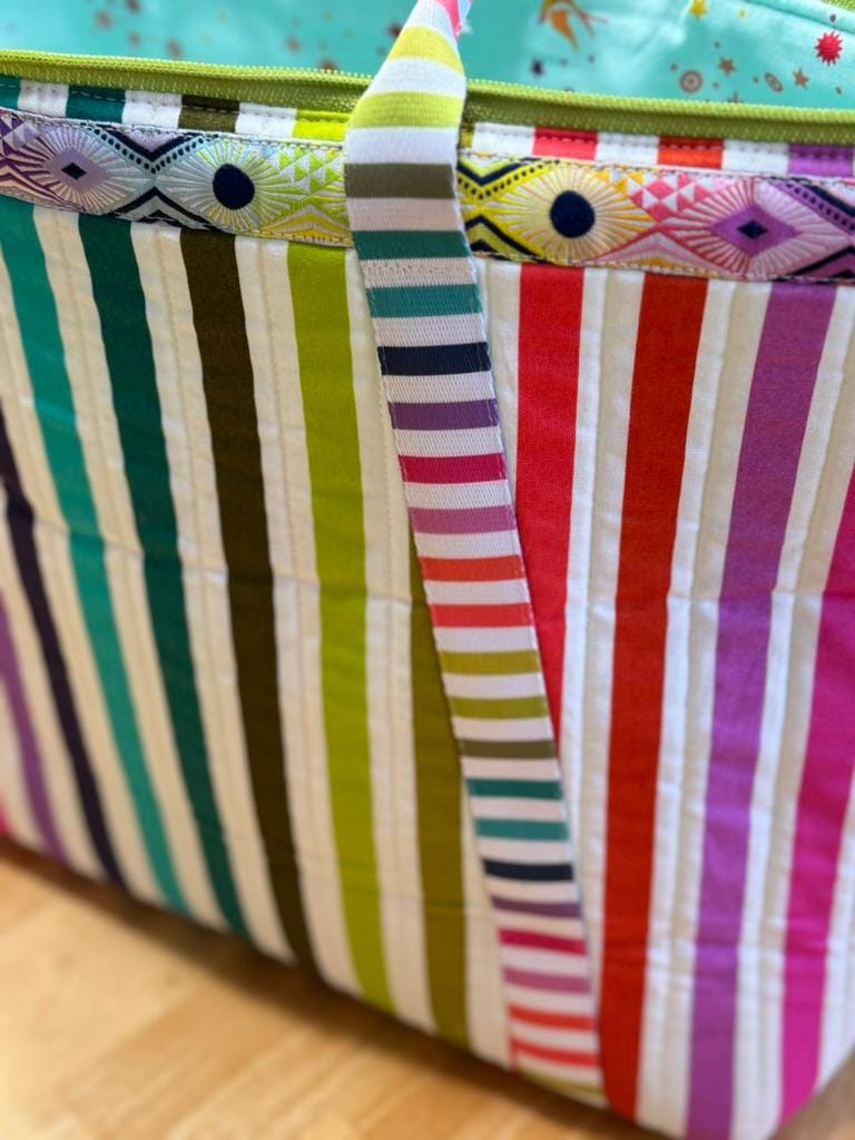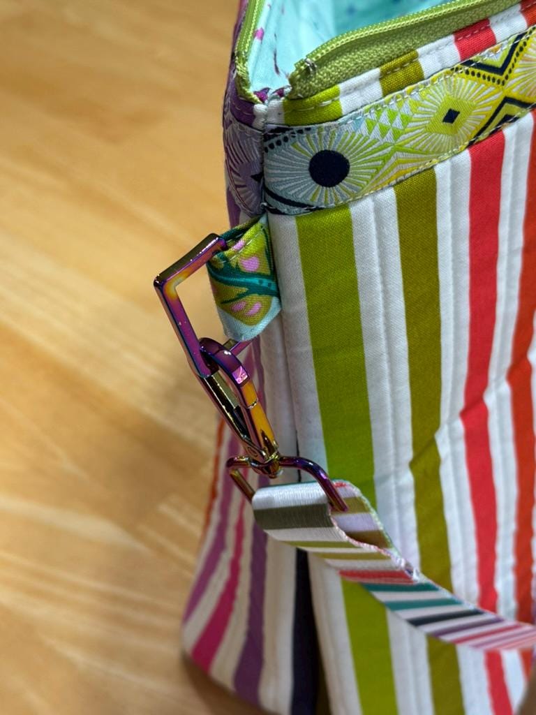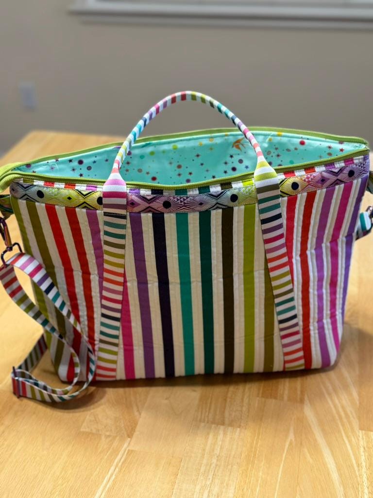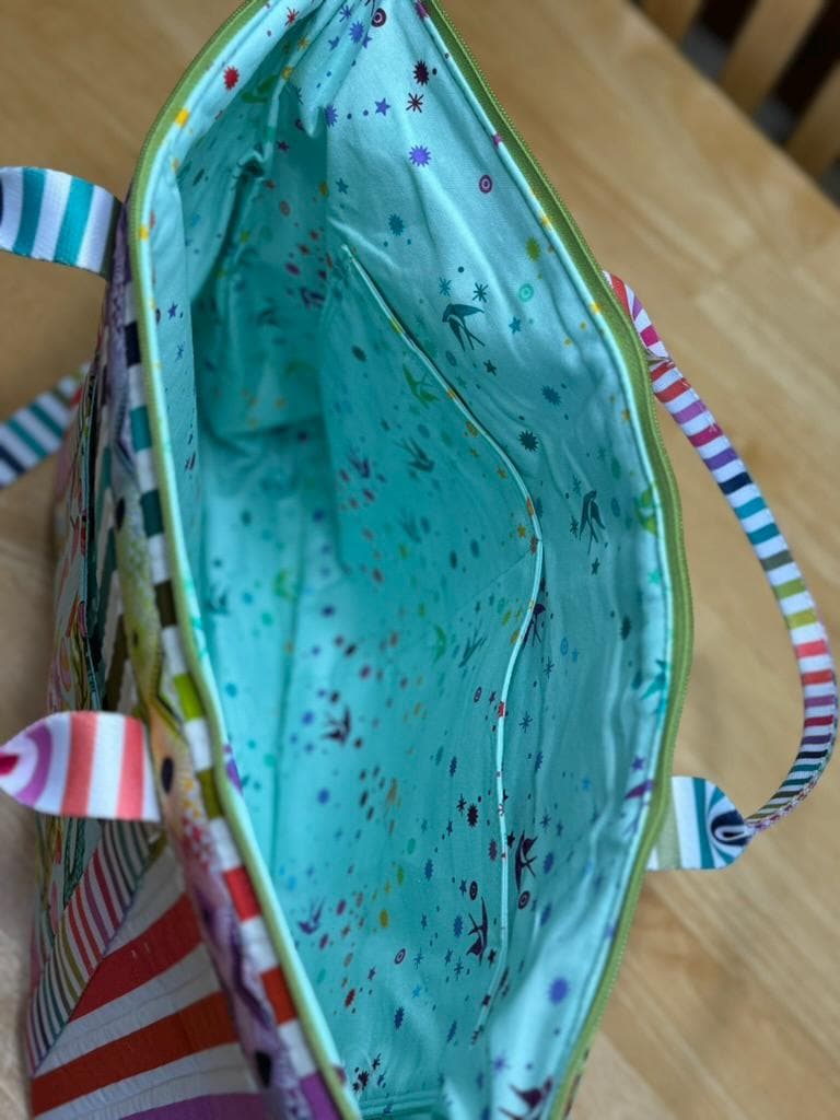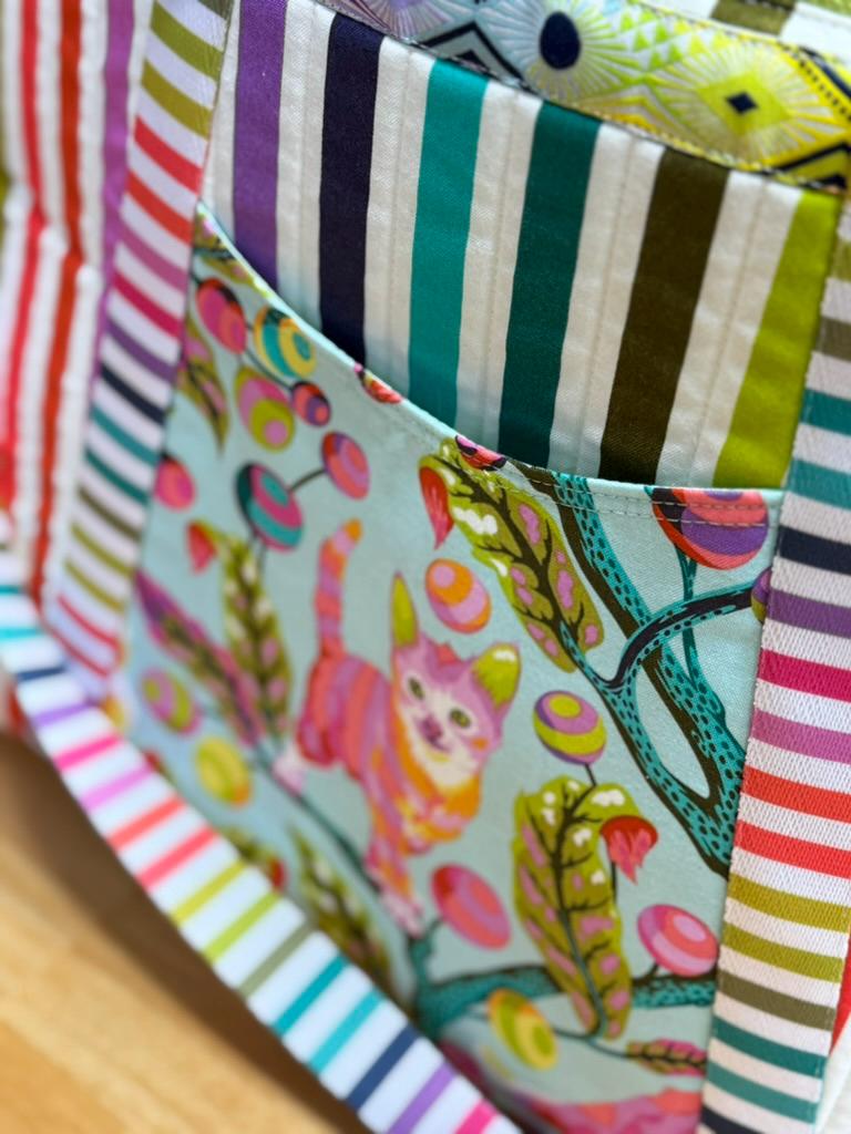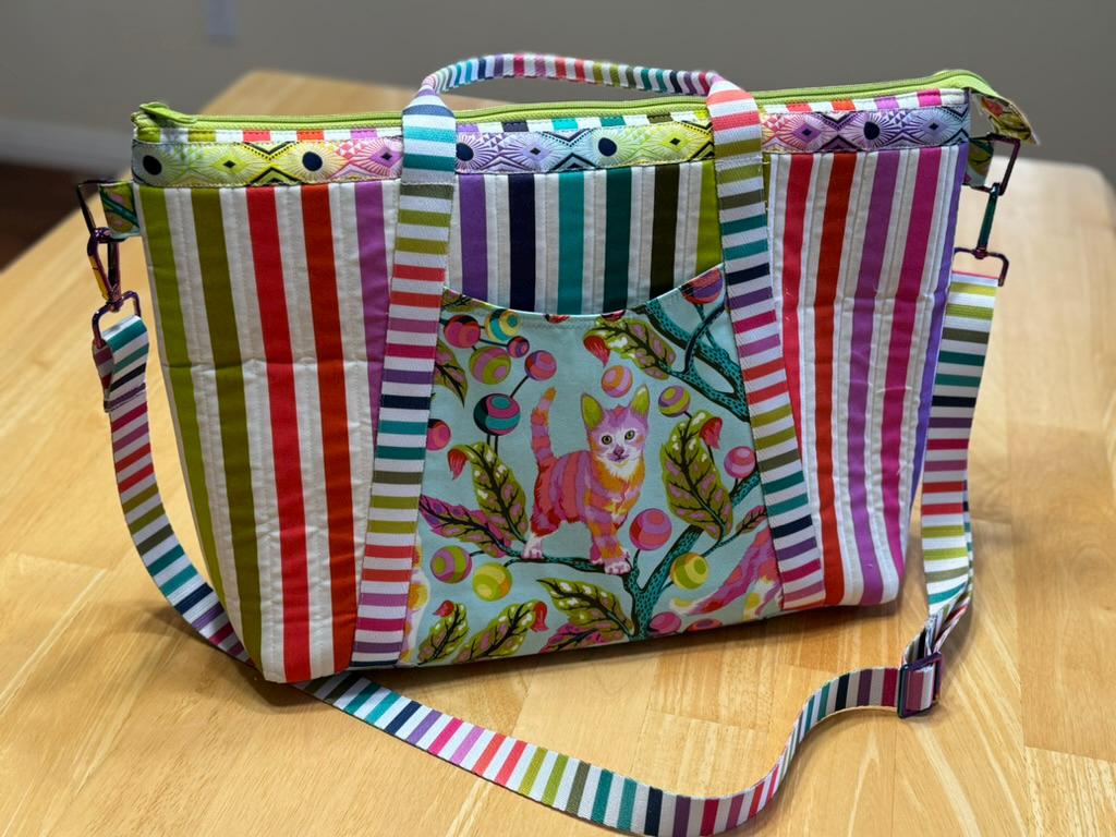 Large zipper top totebag with optional cross body strap. Made from Tula Pink Tabby Road Deja Vu fabric using the @noodlehead Oxbow Tote pattern. Easy access exterior pocket with fussy cut cat to hold phone, keys, etc. Interior divided pocket to hold other small items. Large roomy interior to hold gym clothes or other items. Could be used as an overnight bag.