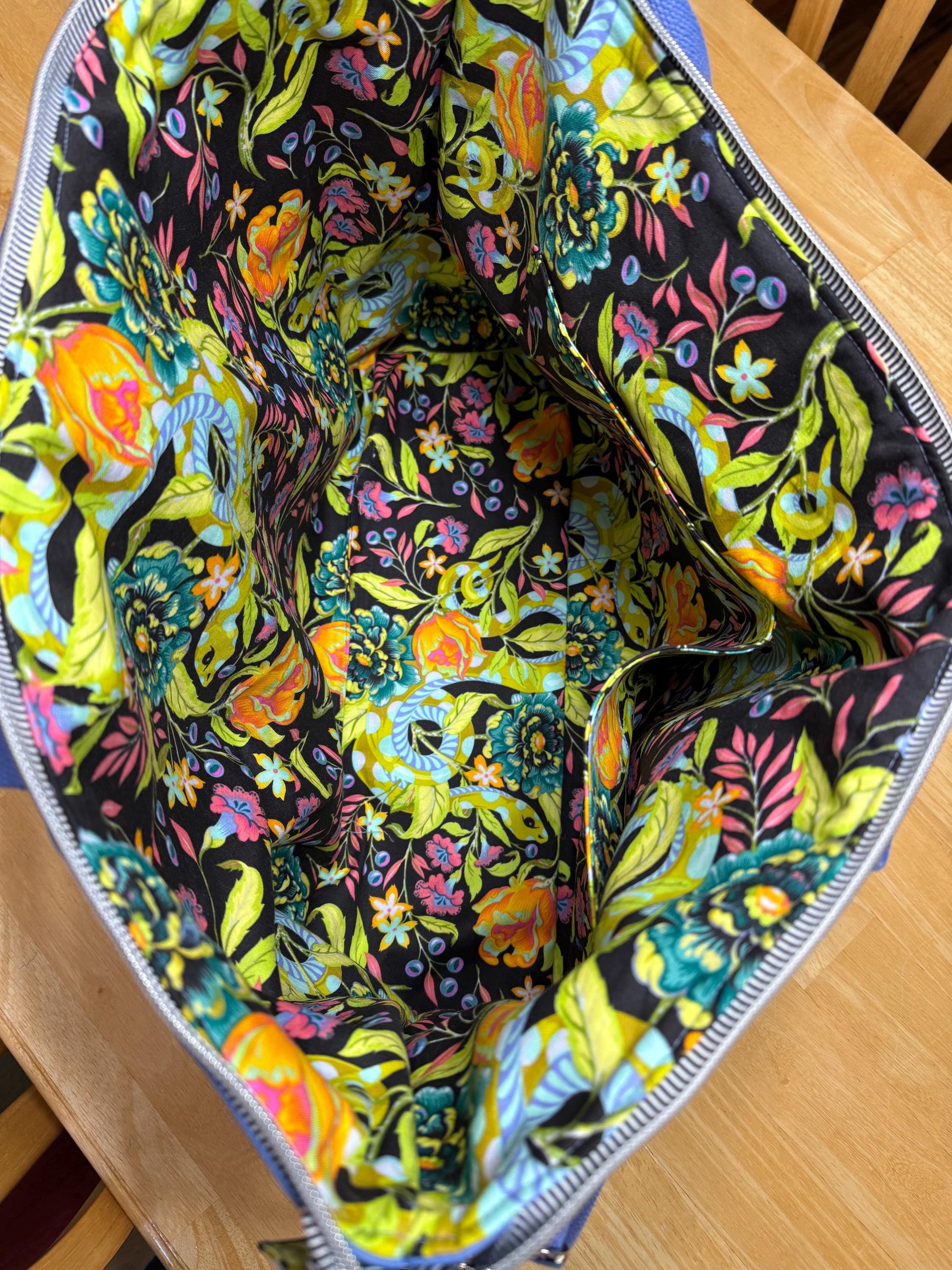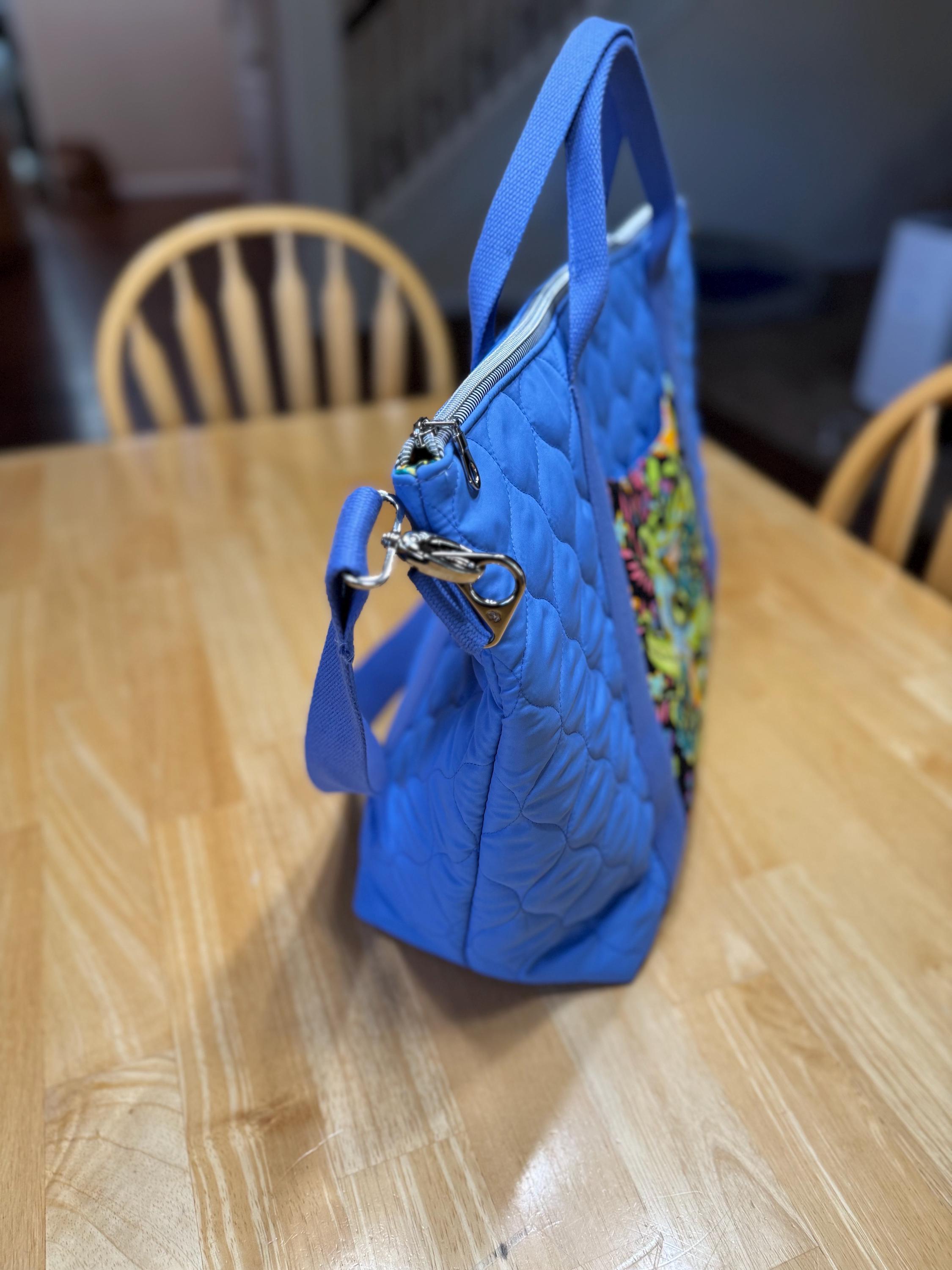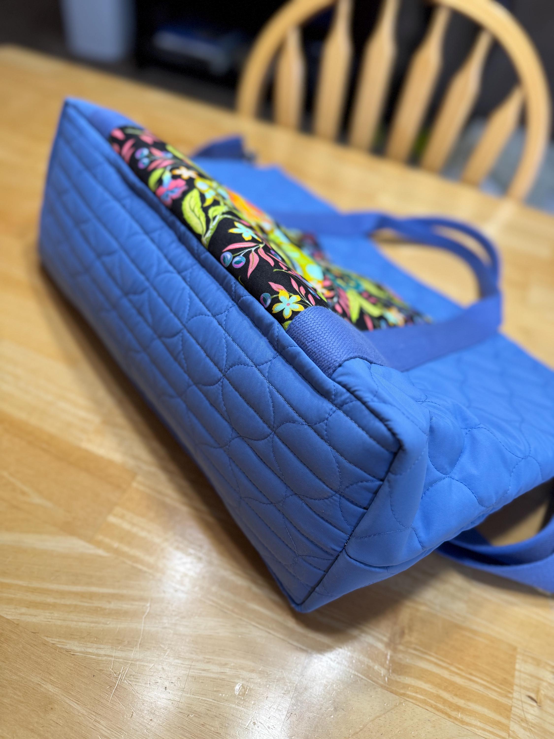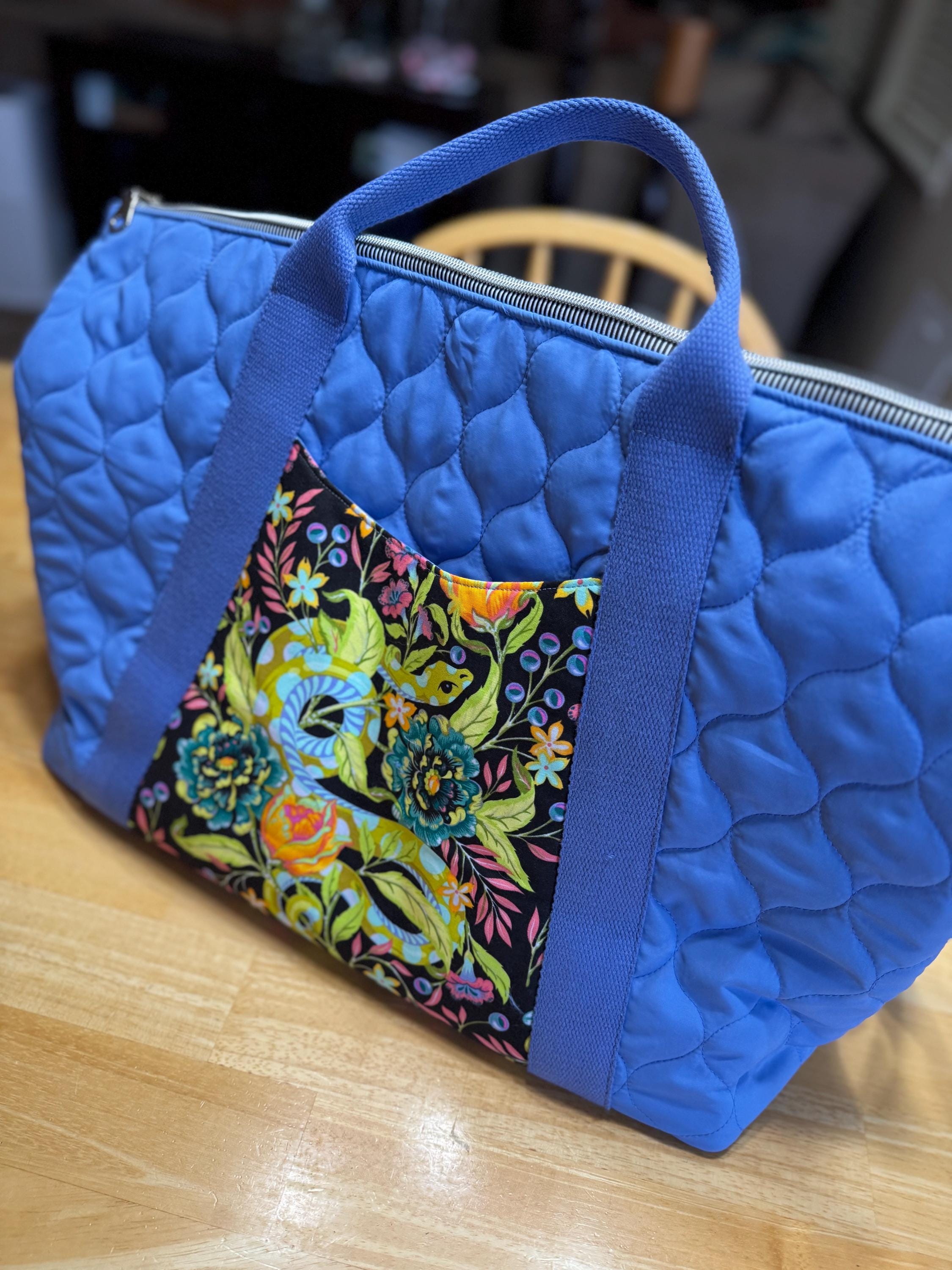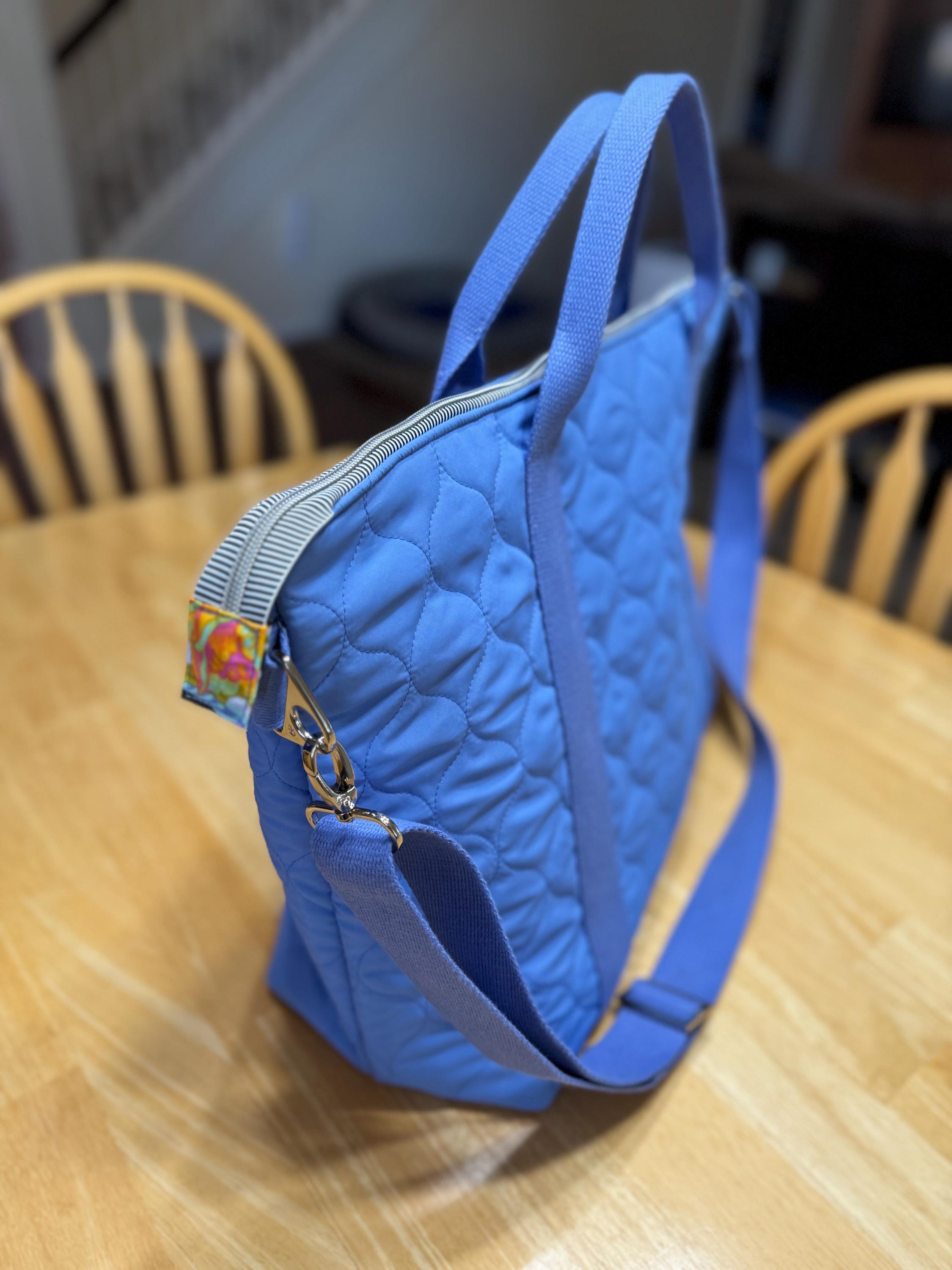 Very large zipper top overnight Tote with optional cross body strap. Made from @stylemakerfabrics quilted puff coating fabric in periwinkle with Tula Pink Moon Garden fabric for the lining and using the @noodlehead Oxbow Tote pattern. Easy access exterior pocket with fussy cut fabric to hold phone, keys, etc. Interior divided pocket to hold other items. Large roomy interior to hold gym clothes or other items. Perfect for a weekender or overnight bag.