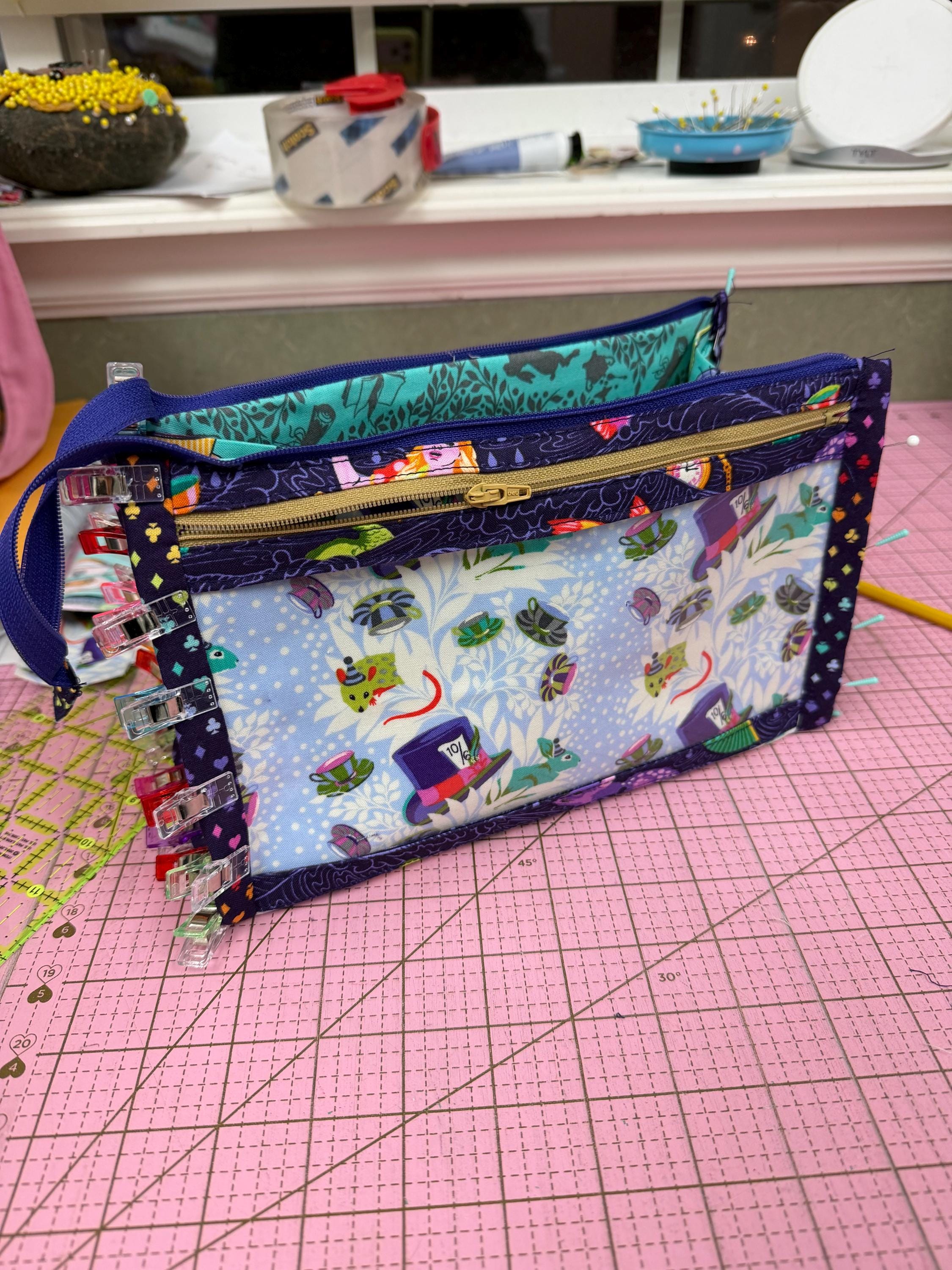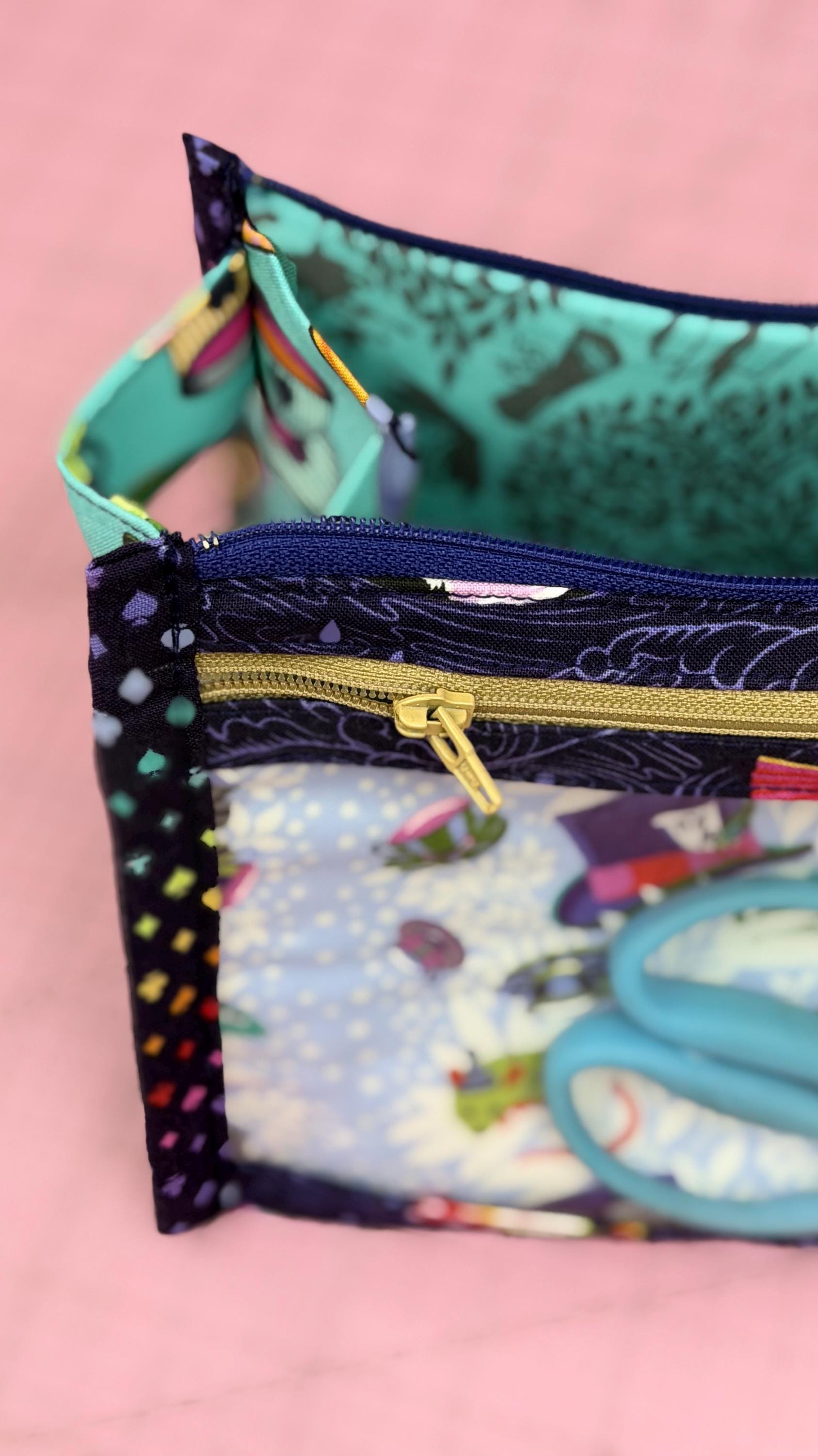 This vinyl pocket pouch is made from Tula Pink fabrics from Free Spirit Fabrics with nylon zippers for easy open/close. The case features a large internal pocket and two exterior vinyl pockets on each side to easily store little items. When closed the case has a chic and modern shape and added fabric zipper pulls add functionality as well as a pop of color.